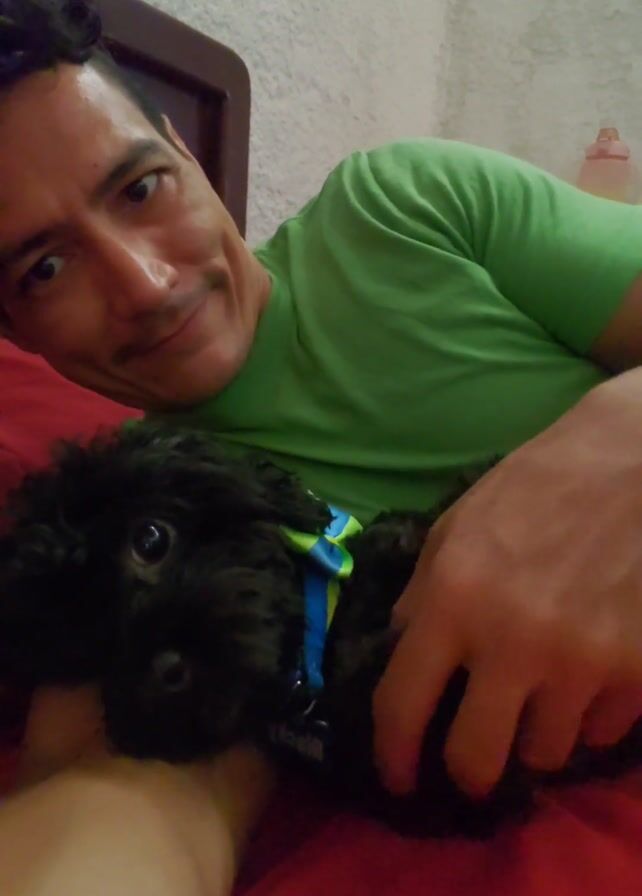 - "A man in a green shirt is lying on a red bed with a small, black, fluffy dog" by FM-FSBWz2, licensed under CC BY 4.0