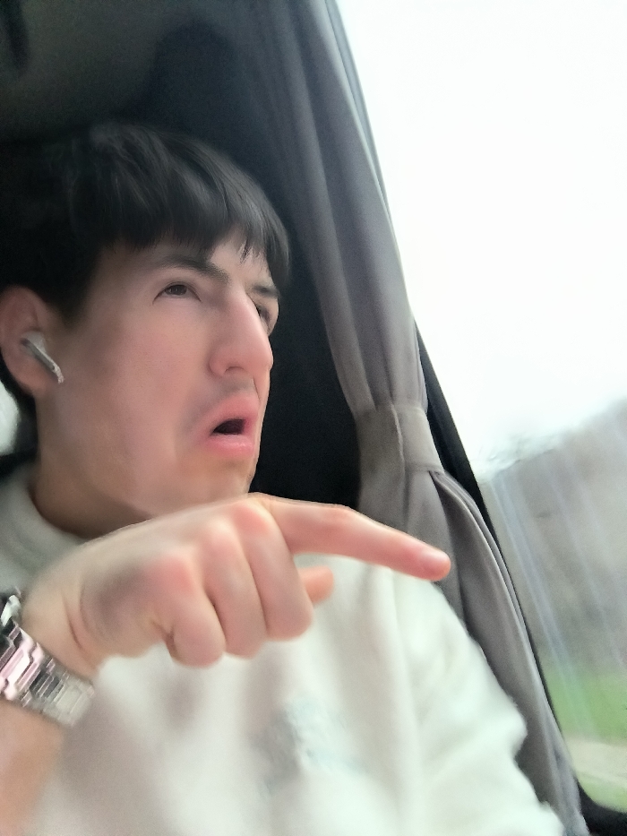 A young male individual is depicted within the interior of a vehicle, located in Petrov Dol, Bulgaria. He possesses dark, short hair and light-toned skin. His mouth is slightly open, and his eyes are directed upwards and to the right. A white wireless earbud is present in his left ear. He is wearing a light-colored, long-sleeved garment, possibly a sweatshirt, which exhibits a faint light blue design on the chest. A silver-toned wristwatch with a metallic link band is visible on his left wrist. His right hand is extended forward with the index finger pointed towards the right side of the frame. To the left, dark fabric vehicle interior elements are visible, while to the right, a vehicle window reveals an exterior view. The exterior view is bright and obscured, consistent with an overcast sky, with a blurred green landscape visible in the lower right background.