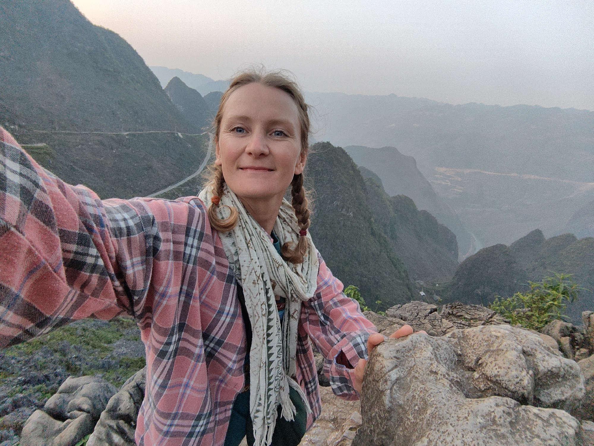 A woman takes a selfie on a rocky outcrop, possibly in the city of Đồng Văn Commune, Vietnam, with mountains in the background. She wears a pink plaid shirt, a scarf, and has her hair in braids. She is holding onto a rock with one hand. The background consists of a mountain range with some haze. There is a road visible on the mountainside.