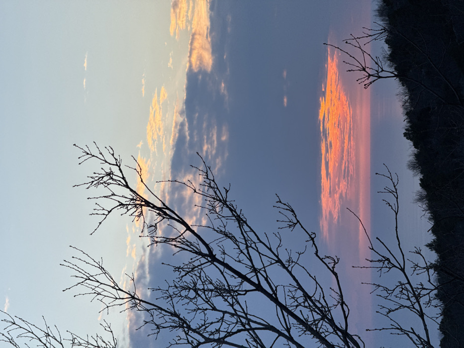 The image captures a landscape scene at sunrise or sunset from an elevated position in Stanišići, Montenegro. The sky dominates the upper two-thirds of the frame, transitioning from a pale blue at the top to a band of darker grey-blue clouds mid-frame. Below these, a horizontal band of vivid orange and pink clouds is illuminated along the horizon. Directly beneath this colored cloud band, a body of water, likely the Adriatic Sea, stretches into the distance, reflecting a faint strip of light. In the foreground, silhouetted against the sky and ocean, are numerous bare, leafless tree branches with visible buds, primarily extending from the left side and a smaller cluster on the lower right. Below the horizon and above the water, a dark, densely forested hillside is also visible in silhouette. No human figures, man-made structures, or actions are depicted.