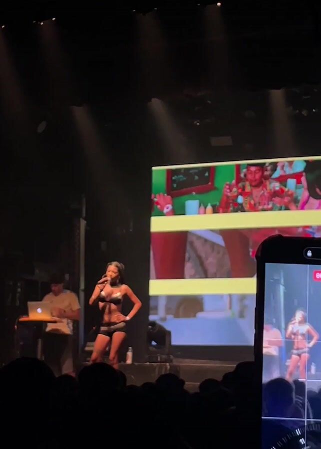 live concert performance from a crowd's perspective. A female singer with dark hair and minimal clothing is performing on a stage. She's holding a microphone and appears to be singing or speaking to the audience. A man in a cap and light-colored shirt stands to her left, operating a laptop on a table. Behind them, a large screen displays colorful visuals. The crowd is silhouetted in the foreground, with some individuals holding up their phones, presumably to record the performance. The stage is lit with spotlights, contributing to the dimly lit atmosphere.