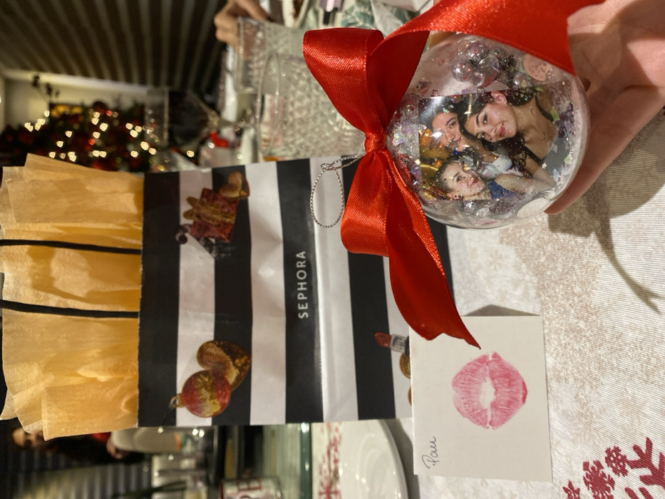 A gift presentation includes a Sephora shopping bag with black and white stripes, adorned with holiday-themed stickers and filled with yellow tissue paper. Next to the bag sits a handmade Christmas ornament, featuring a photo of three girls and embellished with a red ribbon. A small white card with a lipstick kiss and the name "Pau" written in cursive is also part of the gift arrangement. The setup is placed on a tablecloth with a red and white pattern, and a Christmas tree with blurred lights is visible in the background.