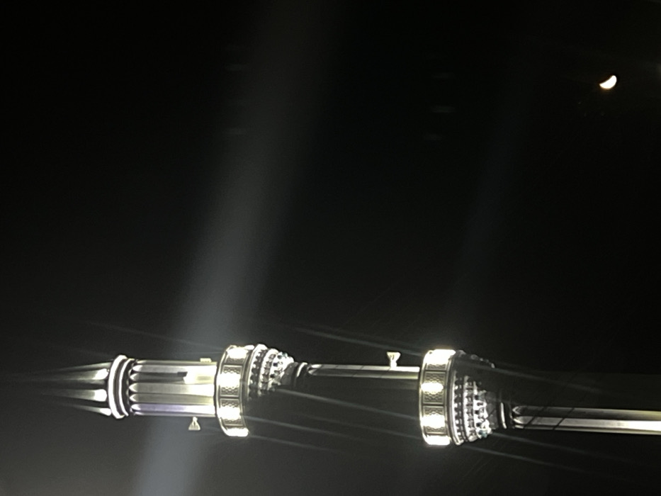 A tall minaret is depicted at night in Kornitsa, Bulgaria. The structure is illuminated by integrated white light sources, highlighting its two distinct circular balconies (sharafahs) and its tapered spire. Prominent light beams radiate outwards from these illuminated sections, visible against the dark, unlit background of the night sky. A crescent moon is discernible in the lower right portion of the frame. No other structures, individuals, or discernible ground features are present.