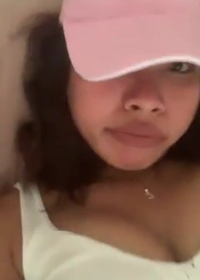 A woman with dark hair, wearing a white top and a pink baseball cap with a pink ribbon emblem, lies on a light-colored surface, possibly a couch or bed. She looks at the camera, and briefly adjusts the hat.