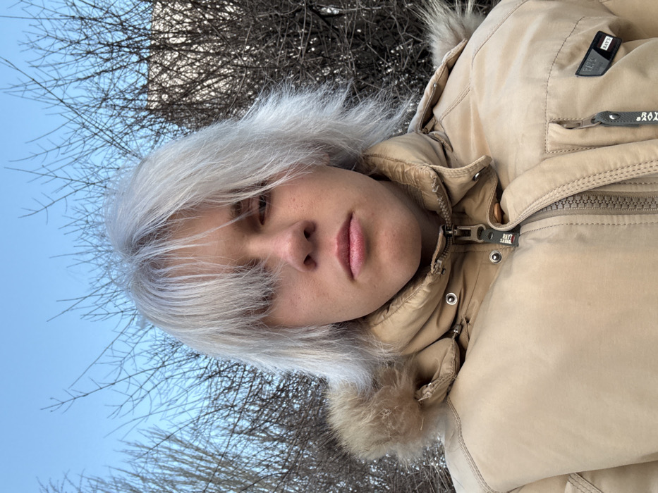 The image displays a close-up, head-and-shoulders portrait of a single individual, depicted in Rostov-on-Don, Russia. The individual has platinum blonde, shoulder-length hair, with a fringe that partially obscures the forehead and the viewer's right eye. The facial expression is neutral, with closed lips and a direct gaze towards the camera. The subject is wearing a tan or beige insulated winter jacket, featuring a prominent main zipper closure, several metallic snap buttons, and a visible fur-lined hood. A black rectangular patch with the white text "R.A.Y.S" is affixed to the jacket's upper left chest area (viewer's right), and similar branding appears on zipper pull tabs. The background consists of a clear, light blue sky in the upper portion and a dense network of dark, leafless tree branches, indicative of a cold season. No specific urban landmarks are discernible within the frame.