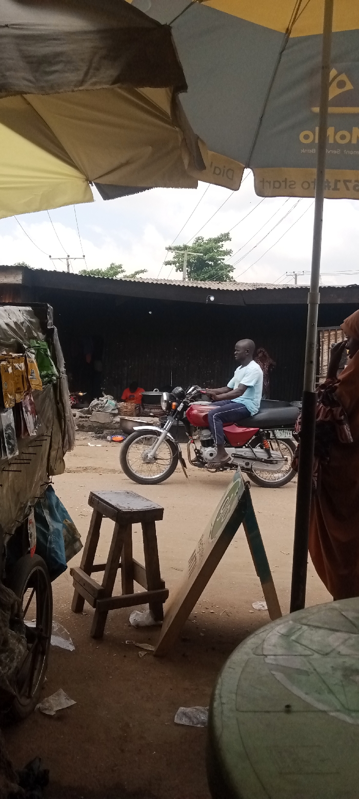 This image captures an active outdoor street or market scene in Madalla, Nigeria, under an overcast sky. Two large umbrellas, one yellow and dark gray with reversed "MoMo" branding, partially frame the top of the scene. In the midground, a dark-skinned adult male with a shaved head, dressed in a light blue short-sleeved shirt and dark blue trousers, is seated on a red motorcycle. The motorcycle features chrome accents, wire-spoke wheels, and a partially visible license plate "JC 577 VW." He is oriented facing left. The ground beneath is unpaved dirt. To the immediate left foreground, a stall or vendor's display is visible, featuring various small packaged items hanging from a structure. A black bicycle wheel is at the bottom left. Centrally positioned in the foreground is a dark-topped wooden stool, with a light-colored A-frame sign leaning beside it to the right. The ground in this area is also dirt, with scattered white plastic debris. To the far right, a person wearing a light brown head covering and garment is partially visible, obscured by a foreground element, with their hand near their face. In the background, a dark-colored, open-fronted building with a corrugated metal roof extends horizontally. Inside this structure, a person in an orange top is visible near large cooking pots, suggesting food preparation activities. Another individual is partially discernible further to the left within the building. Overhead, numerous electrical wires traverse the sky, supported by wooden utility poles. Green tree foliage is visible in the distance on both the left and right sides of the background.