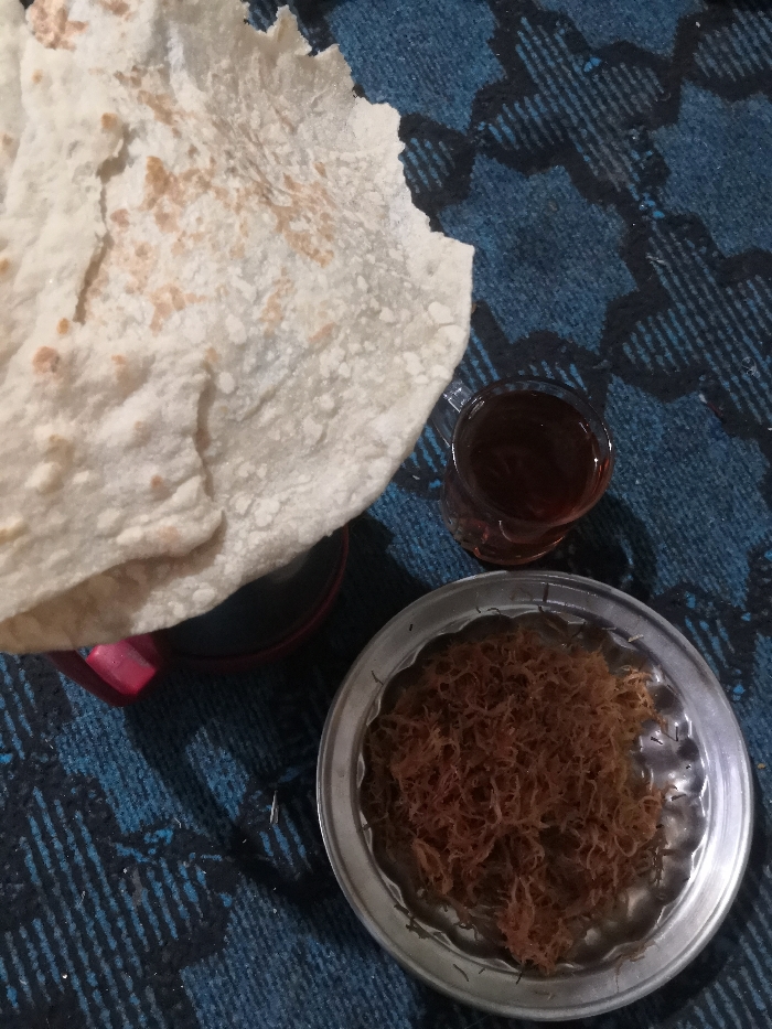 This overhead image, captured in Akhundzadakhail, Pakistan, presents a still life arrangement of food and drink on a patterned textile surface