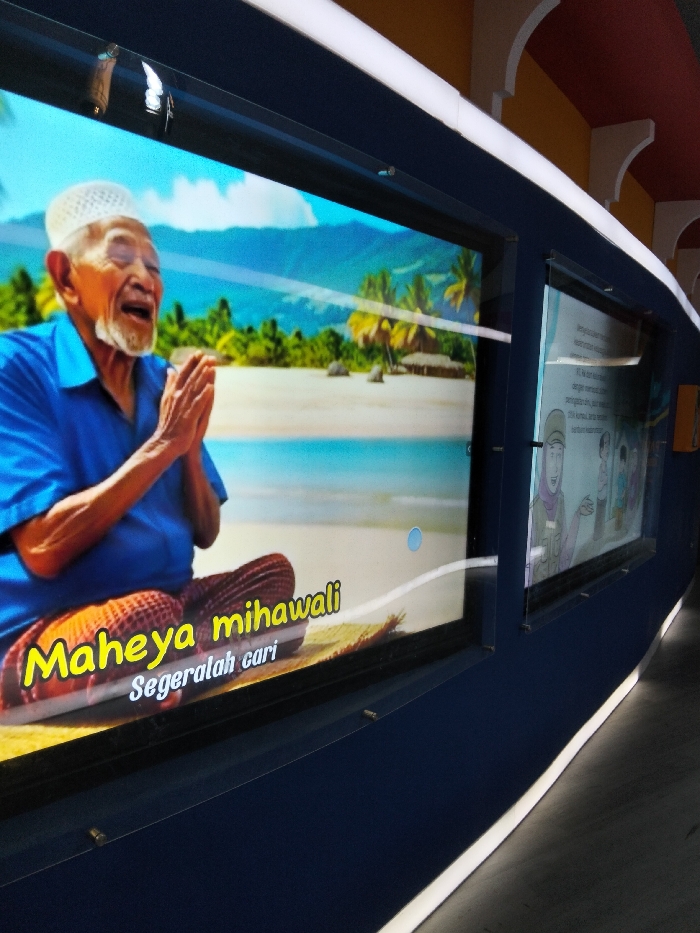 A display features an image of an elderly man in a blue shirt and white cap, hands clasped in prayer, set against a beach backdrop with palm trees. Yellow text overlaid on the image reads "Maheya mihawali Segeralah cari." Adjacent to this display is another encased image with cartoon-style figures, likely part of the same exhibition or informational series. The display structure is dark blue with a white trim, and the surrounding architecture hints at a corridor with arches in the background.