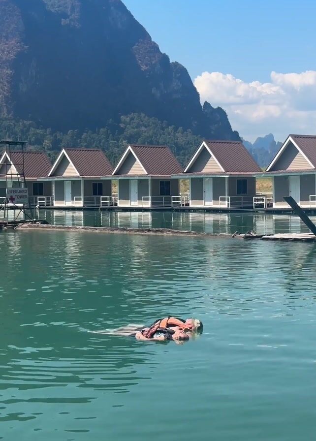 A person wearing a life jacket is floating on their back in the water, with a backdrop of several floating bungalows and a large mountain range