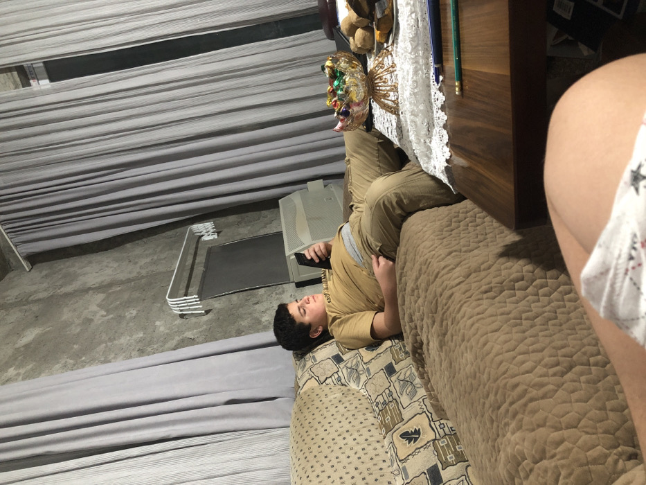 The scene is an interior view within a residential setting in ქვედა სამება, Georgia. A male individual, appearing to be a teenager or young adult, reclines on a multi-patterned fabric couch. He wears a tan t-shirt, a visible gray undershirt, and tan pants. His attention is directed towards a black smartphone held in both hands. His legs are extended across the couch, which is covered with a brown, quilted throw blanket. To the right of the male, a dark brown wooden table is partially covered by a white lace tablecloth. On the table, a clear glass bowl with a gold-colored base contains various individually wrapped candies. Adjacent to the bowl, a plate holds several brown, irregular items. Two pencils, one blue and one green, are also visible on the table. The background features a rough, light gray concrete wall. Two light gray, pleated curtains flank a window area. A white metal drying rack is mounted on the concrete wall, above a dark-framed object that leans against the wall, possibly a mirror or picture. Below this, a light-colored appliance with vents is situated. The lower foreground of the image shows the legs and lap of a second individual, indicating the perspective of the photographer. The overall lighting suggests an indoor evening or low-light condition.