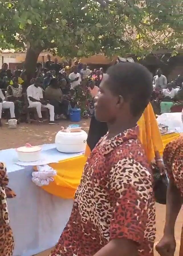 group of people at an outdoor event. A young woman in a leopard print dress walks and dances, smiling and waving. Another woman, wearing a yellow suit and a sash that reads "AKWANGA", stands behind her. Several other people are also dressed in leopard print attire. In the background, there's a crowd of seated people, some under a tent, and buildings. The environment seems festive.