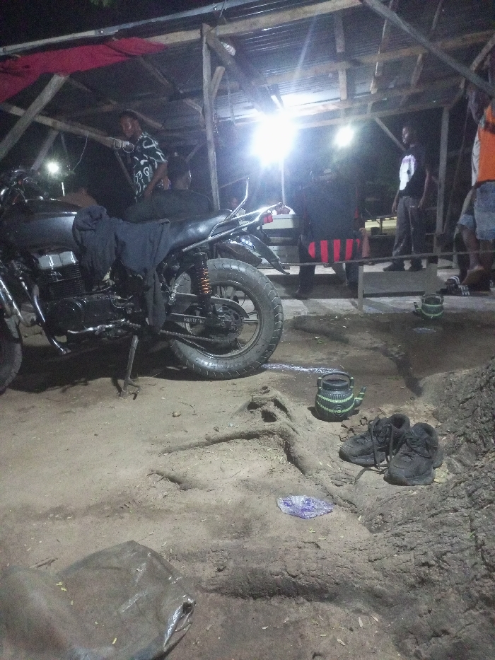 This image depicts a nighttime outdoor scene under a rudimentary open-sided shelter in an unspecified urban or semi-urban location. The ground consists of uneven, packed dirt with exposed tree roots prominent in the foreground. Approximately 5-7 individuals are present within and around the shelter. In the midground, a male wearing a patterned dark and light shirt stands near a motorcycle. Another individual is seated on a black motorcycle, facing away from the camera. Additional figures are visible in the background, standing or sitting. All individuals appear to be casually dressed. Two black motorcycles are parked on the dirt ground. The central motorcycle is a standard or custom style with knobby tires, an exposed orange rear shock absorber, and "HARTESHA" visible on its chain guard. Dark fabric is draped over its seat. A second, partially visible motorcycle is in the left foreground, resting on its kickstand. The shelter is constructed from wooden posts and beams, supporting a roof made of red fabric or tarp and corrugated metal sheets. Several unshielded, bright white light sources are affixed within the shelter, providing illumination and casting strong shadows. On the dirt ground, two dark-colored, decorative teapots with green striped patterns are present, one near exposed tree roots. A pair of worn, dark shoes are also positioned on the ground near these roots. Minor debris includes a small crumpled piece of purple plastic or paper and a larger gray/brown plastic bag in the bottom-left foreground.
