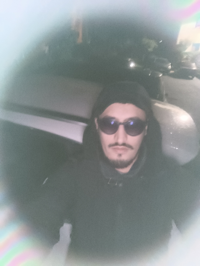 The image depicts an adult male centered in a low-light outdoor setting, situated in the city of Meknes, Morocco. The scene exhibits a circular vignette effect and lens flare, with a distinct rainbow-colored streak visible in the lower-left corner. The subject is an individual wearing a dark beanie or hood pulled over his head, dark sunglasses, and a dark hoodie or jacket with a visible collar detail. He has a mustache and a soul patch/goatee. The individual is positioned facing directly towards the camera, presenting his upper torso. Behind the subject, the rear portion of a light-colored vehicle, likely a car, is partially visible. The background beyond the vehicle is dark and out of focus, showing blurred points of light, indicating an urban environment at night. The individual is stationary, posing for the photograph.