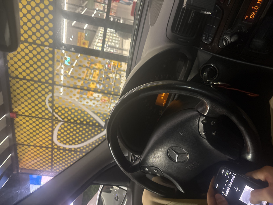 A forensic description of the scene reveals the interior of a Mercedes-Benz vehicle, observed from the driver's seat, looking outward through the windshield