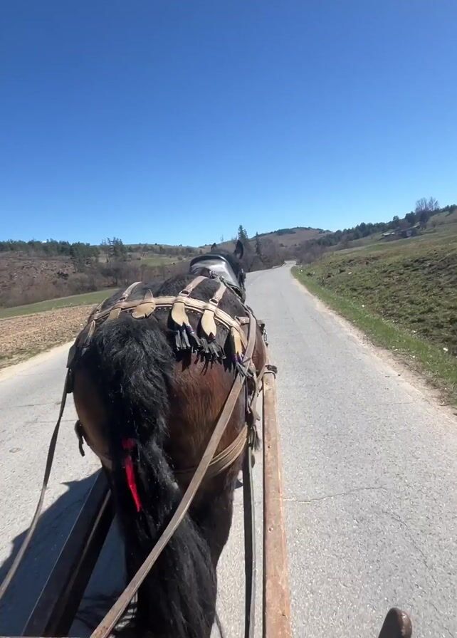 horse pulling a wooden cart along a paved road on a sunny day. The horse is brown with a black tail and wears a harness. The cart is partially filled with various items, including plastic bottles. The road winds through a rural landscape with green fields and trees. The sky is bright blue with a glaring sun. The camera appears to be mounted on the cart, providing a view from the back.