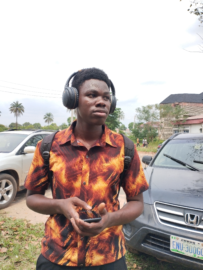 The image captures a young Black male standing outdoors in Ihiagwa, Nigeria