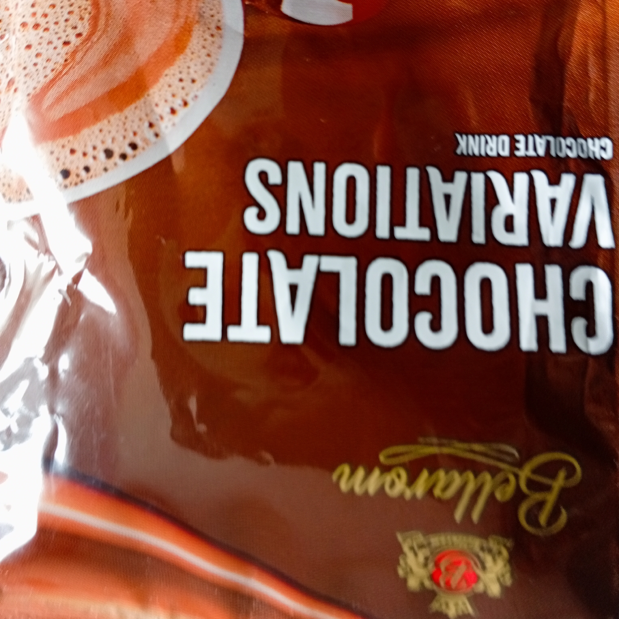 The image displays a close-up, angled view of product packaging, predominantly brown in color, with visible creases and light reflections on the left side. The packaging features white, capital letter text oriented vertically, spelling "CHOCOLATE VARIATIONS." Above this, also in white capital letters but inverted and oriented horizontally, is the phrase "CHOCOLATE DRINK." In the upper left portion of the image, a partial graphic depicts a frothy beverage in a white cup, garnished with brown speckles. Towards the bottom right, an inverted yellow cursive script reads "Bellarom," accompanied by an inverted golden emblem featuring a red oval containing a stylized letter 'B'. No individuals, discernible actions, or environmental context beyond the packaging itself are present. The specific location in the city of Harmanli, Bulgaria, cannot be determined from the content of this image.