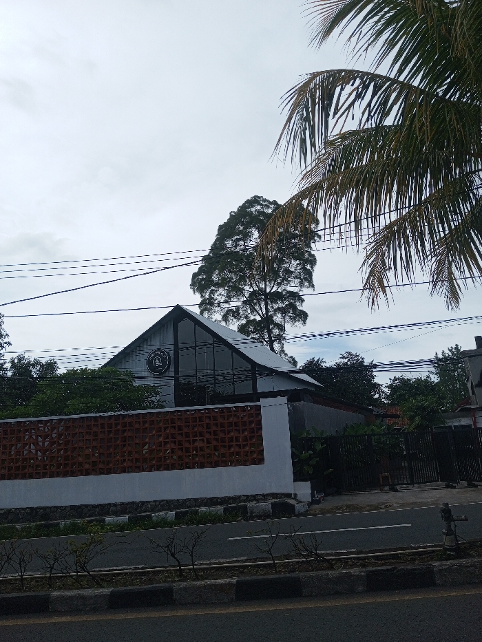 A modern, gabled-roofed building with a glass front is partially obscured by a textured brick wall. Lush green foliage surrounds the structure, including a tall tree rising behind it and palm fronds at the right. Power lines cut across the sky. A grey road with a marked median lies in the foreground. The sky is overcast.
