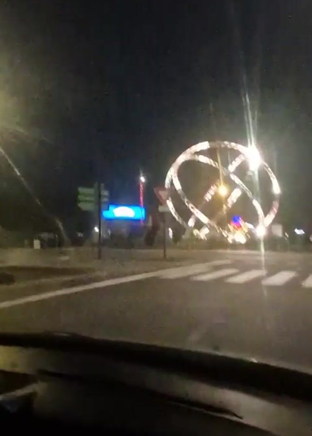 The video is shot from inside a moving car at night, showing a large, spherical structure decorated with lights