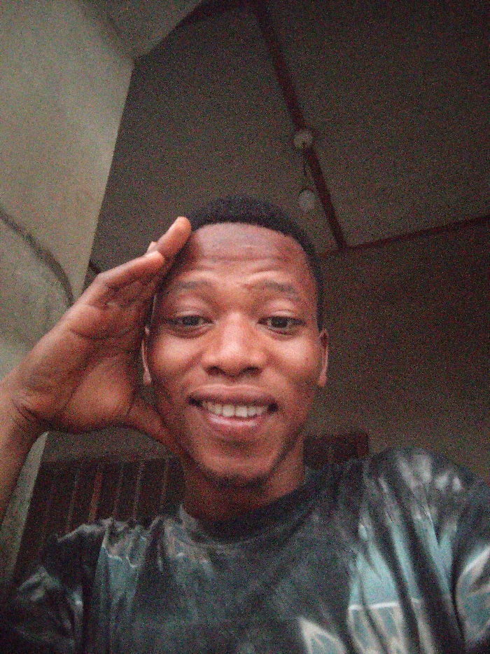 A smiling man with short dark hair is pictured in a selfie. He holds his right hand to his forehead in a salute gesture. He is wearing a dark t-shirt with a blue pattern. The background consists of interior walls and a ceiling with a light fixture. The image has significant noise, and the lighting is poor.