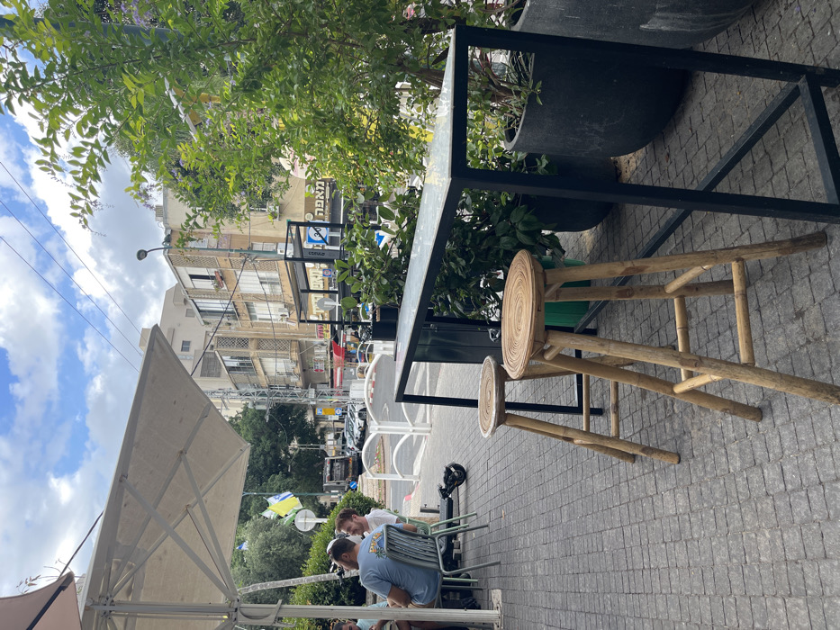 The image depicts an outdoor cafe seating area on a paved sidewalk in Givatayim, Israel, specifically identified as likely located near Landwer Coffee on Weizmann Street