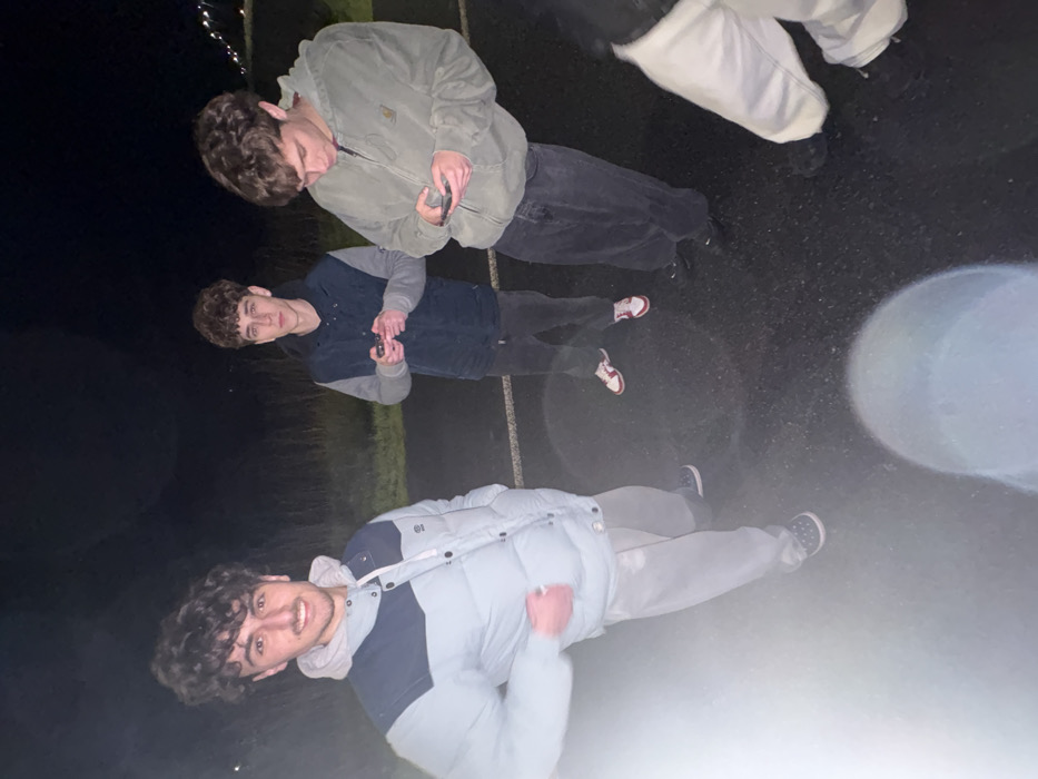 The image depicts four young males standing outdoors on a paved asphalt surface at night in Mirandela, Portugal