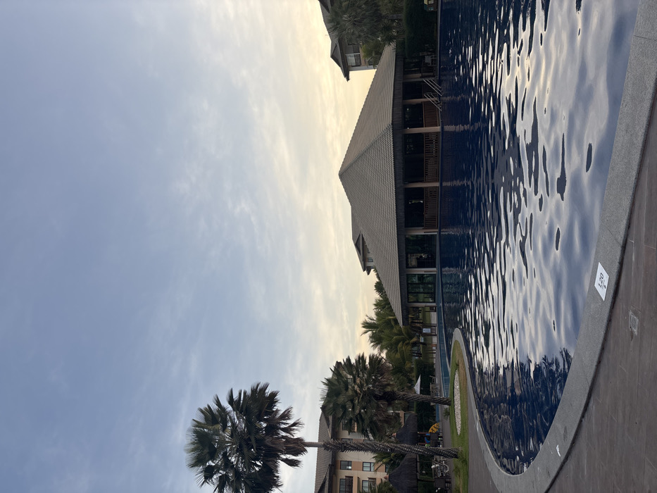 A serene outdoor scene features a large, curved swimming pool reflecting the surrounding architecture and sky. A structure with a tiled roof stands at the pool's edge, possibly a bar or lounge area. Palm trees punctuate the landscape, adding to the tropical ambiance. Buildings are visible in the background, suggesting a resort or residential complex. The sky is a blend of blue and soft orange, likely indicating either dawn or dusk. The overall impression is one of tranquility and leisure.