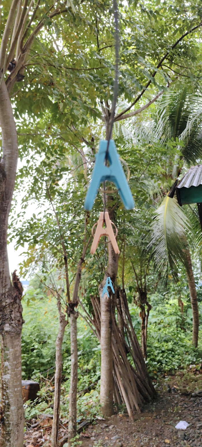 The image depicts an outdoor, vegetated scene in Jurong Pante, Indonesia. Centrally, three clothes pegs are suspended vertically by dark-colored wire or string. The uppermost peg is large and light blue plastic. Below it, a large, light brown plastic peg hangs. The lowest peg is small and light blue plastic. Surrounding these objects are numerous tree trunks and dense green foliage, indicating a lush environment. Prominent tree trunks are visible on the left and central-right foreground. A cluster of cut logs or branches leans against a tree trunk on the right. In the upper right quadrant, a section of a corrugated metal roof is partially visible, suggesting a nearby structure. The ground is earthen, covered with some scattered leaves and debris. No people are present, and no overt actions or interactions are occurring. The lighting is diffuse, suggesting an overcast day or shaded conditions.
