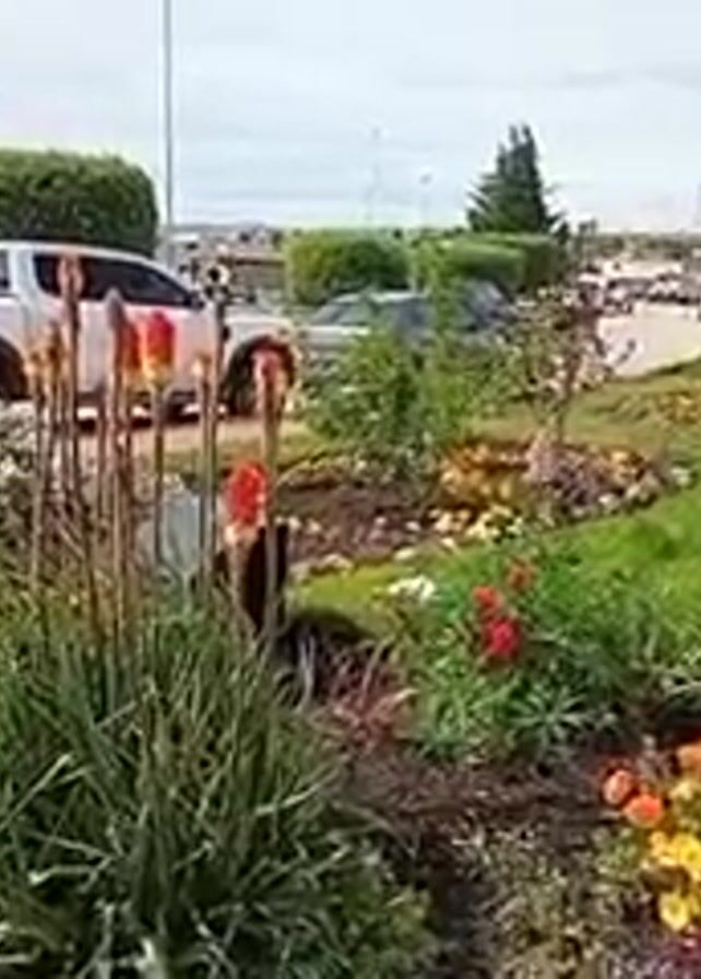 The video depicts a roundabout decorated with colorful flower beds, grass, small shrubs, and some taller plants with orange flowers