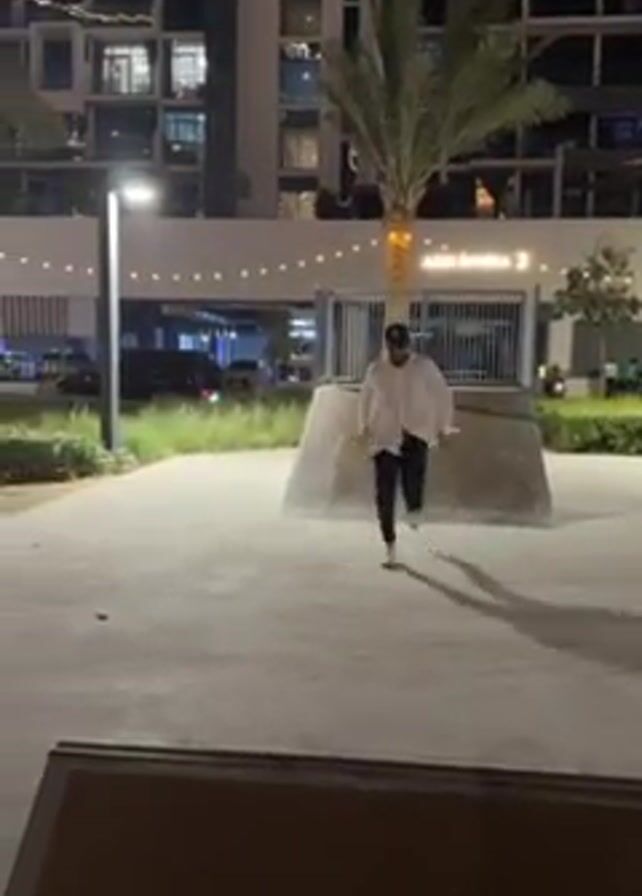 A man in a white shirt, black pants, white sneakers, and a black baseball cap is performing parkour moves in a brightly lit outdoor area at night. The area appears to be part of a modern residential complex with apartment buildings in the background. The man runs towards a triangular concrete structure and jumps over it, landing on the other side before continuing to run and jump over another similar structure. There are also palm trees, lampposts, and other greenery in the vicinity. The lighting is artificial, illuminating the scene effectively.