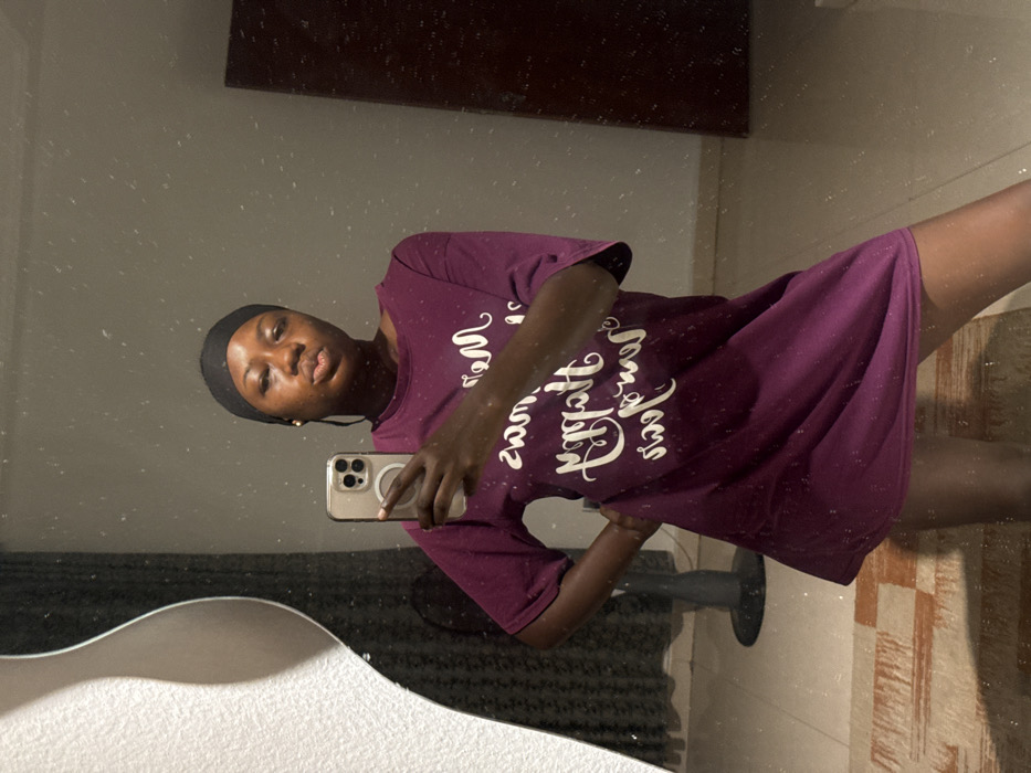 A young, dark-skinned woman is seen in a mirror selfie. She wears a dark head wrap and a maroon t-shirt dress with white text. The phone she is holding has a light-colored case. Reflections of the bathroom are visible, including a sink and a tile floor. The overall lighting is soft, and the focus is primarily on the woman's face. The image is rotated to the right.
