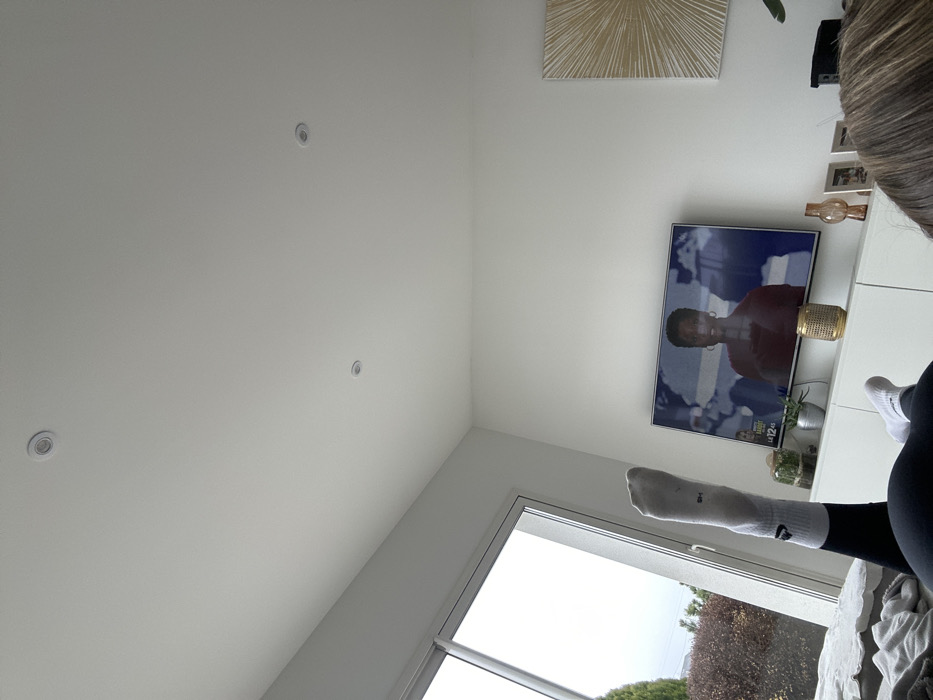The image depicts an indoor scene in Veauchette, France, captured from a low perspective, focusing on a person in a relaxed posture. In the foreground, the top of a person's head with brown hair is visible on the bottom right, alongside their legs extended upwards. The person is wearing black leggings and white ankle-length socks. The left sock, raised higher, features a dark logo comprising three parallel stripes and a letter-like element resembling an 'H' below them. A large flat-screen television is mounted centrally on a white wall, displaying a news program. The screen shows a dark-skinned female presenter with short dark hair, wearing a red top, against a backdrop of a world map graphic. The text "LA 12:45" is visible in the lower-left corner of the television screen. Below the television, a long, low white cabinet with multiple compartments holds several items: a small glass terrarium with a green plant, a metallic cylindrical pot with another green plant, a golden woven decorative cylinder, a reddish-brown textured glass vase, three horizontally arranged framed photographs or pictures, and a dark rectangular object. To the right of the television, a large square piece of wall art with a golden sunburst or radial pattern is affixed to the white wall. To the left, a large floor-to-ceiling sliding glass window provides a view of an overcast sky and outdoor foliage, including reddish-brown shrubs and green trees. The white ceiling is equipped with three recessed circular downlights. A rumpled grey blanket or duvet is partially visible on the bottom-left edge of the foreground.