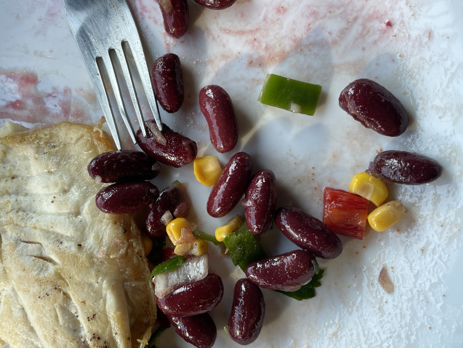 The image displays a close-up, overhead view of a partially consumed meal on a white ceramic plate, located in Bozhurishte, Bulgaria. A portion of cooked white fish fillet, lightly seasoned, occupies the upper left quadrant of the plate. Numerous dark red kidney beans are scattered across the plate, some intermingled with yellow corn kernels, diced red bell pepper, and chopped green vegetable pieces. A silver metal fork is visible on the right, with its tines inserted into several kidney beans. The plate's surface exhibits food residue and reddish streaks, indicating recent consumption. No individuals are present in the scene.