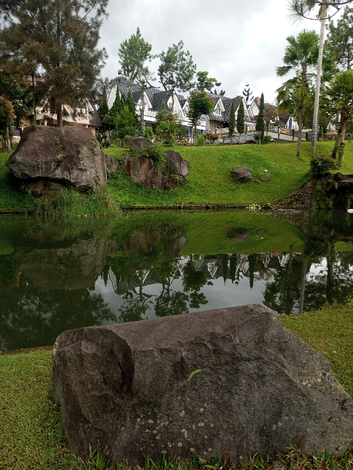 The image depicts an outdoor landscape scene in Sarwahi Mal., India. In the immediate foreground, a large, dark grey boulder rests on green grass. A calm, dark green body of water occupies the midground, reflecting the grey overcast sky, trees, and architectural structures. The water's edge on the left features smaller, dark rocks interspersed with green vegetation, while on the right, the water meets a low, stone-lined structure. Beyond the water, a gently sloping expanse of green lawn extends, dotted with various trees, including tall conifers and slender palm trees. On an elevated section of the landscape, a series of white or light-colored buildings with distinct dark grey gabled roofs and multiple prominent dormer windows are visible. The sky is uniformly overcast. No individuals or specific activities are present within the frame.