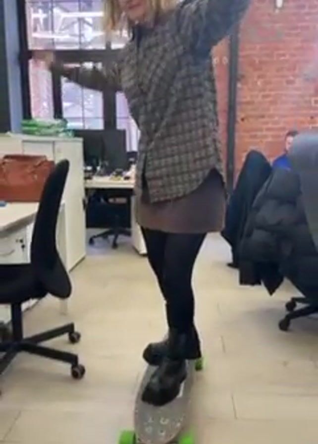A woman with blond hair rides a longboard inside an office. She wears a brown plaid shirt, black tights, and black boots. The longboard has bright green wheels. She starts near a window and a desk, then rides between office chairs and desks. She holds her arms out for balance. At the end of the clip, she turns to face the camera and waves her hands. Other people are visible in the office background. The office has white desks and a brick wall.