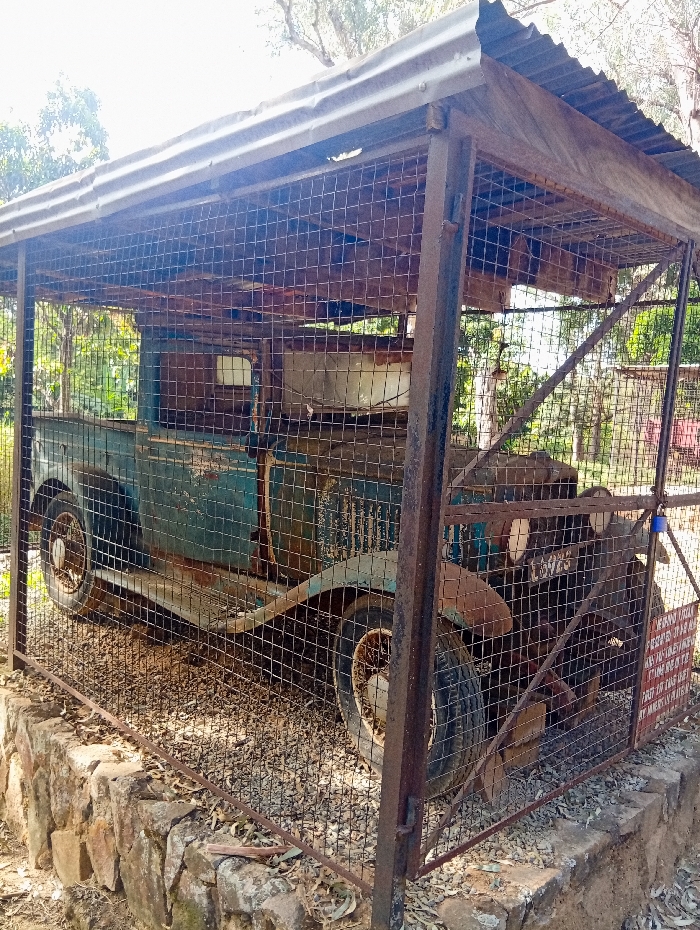 An antique, severely rusted teal or dark green pickup truck is displayed within a weathered, rectangular metal cage under a corrugated iron roof