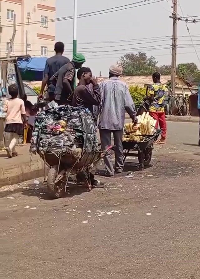 The video depicts a street scene during daylight. Two individuals stand near a tricycle laden with goods. A third person stands beside them, pushing a two-wheeled cart filled with corn. Several people are seen moving in the background. The setting seems to be a street with a building on one side and a street stall on the other. Power lines and a tall pole are visible overhead. The surface of the road appears to be asphalt.