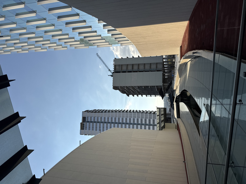 - "The low-angle view shows modern architecture, featuring two tall buildings against a clear sky, one under construction with a crane" by FM-3UnWB3, licensed under CC BY 4.0
