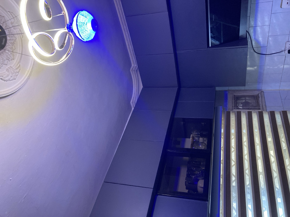 This image depicts an indoor kitchen space, illuminated primarily by a strong blue light, located in Sani Mai Nagge, Nigeria