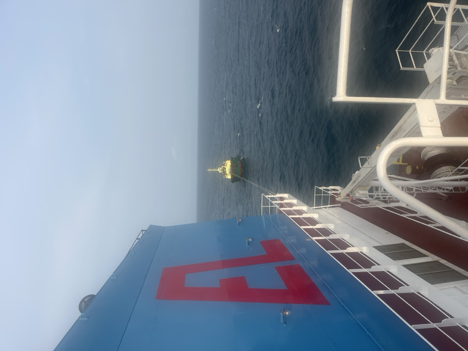 A tugboat is towing a massive ship. The ship has a blue exterior with a large red symbol. The ocean stretches out, a dark blue expanse beneath a light blue sky. The photograph is taken from an elevated position on the ship, capturing the deck's railing and machinery in the foreground.