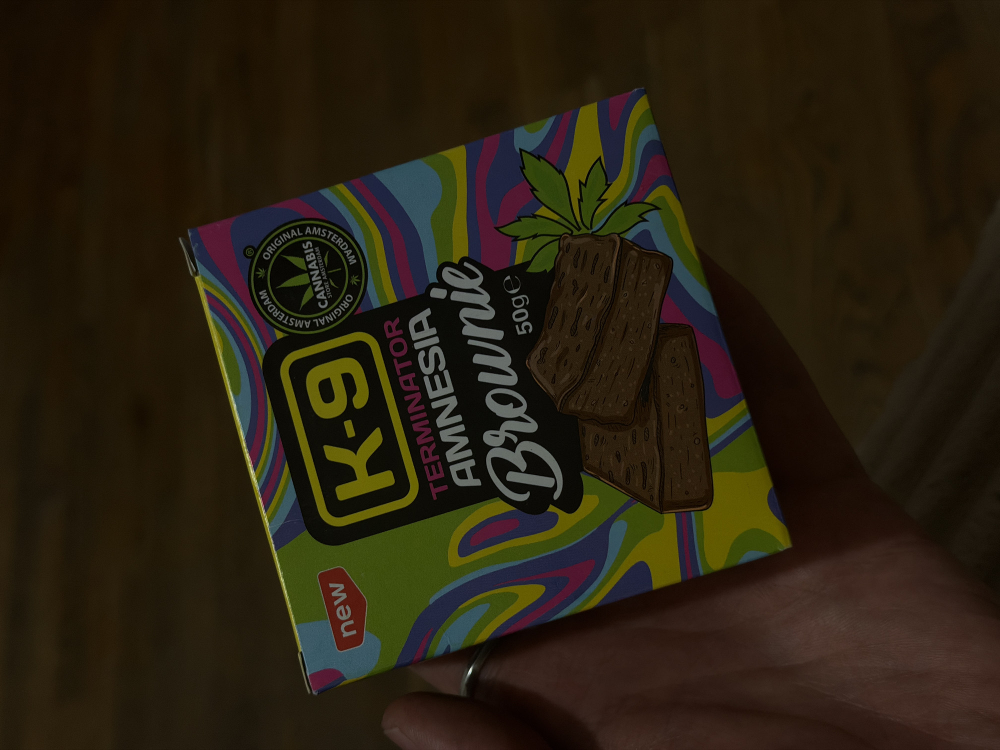 The scene, set in Yerevan, Armenia, captures a person's left hand holding a multi-colored rectangular box diagonally. The box features a psychedelic swirl pattern in shades of blue, green, yellow, and pink. On the front, a black banner displays "K-9" in yellow text, with "TERMINATOR AMNESIA Brownie" printed below, followed by "50gE". A red "new" label is present in the upper left. A circular logo in the upper right includes "ORIGINAL AMSTERDAM" and "CANNABIS STORE AMSTERDAM" encircling a green cannabis leaf icon. Two stylized brown brownies and an additional green cannabis leaf graphic are depicted on the lower portion of the box. The visible portion of the hand includes the thumb and fingers, with a plain silver-colored ring on the ring finger. The background is a dark, out-of-focus surface, possibly wood, under low light conditions.