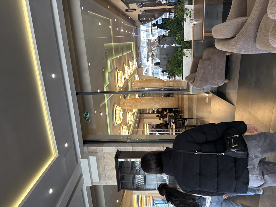 The image depicts an indoor scene within a modern establishment in Tsakhkadzor, Armenia, likely a restaurant or a hotel dining area