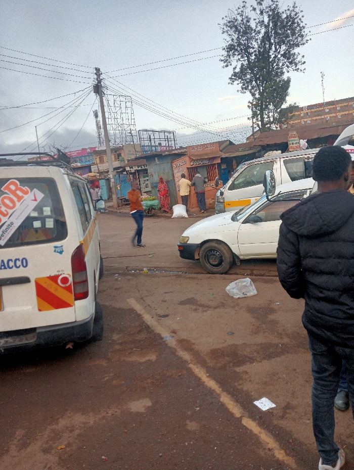The image captures an outdoor street scene in Nyahururu, Kenya, under an overcast sky