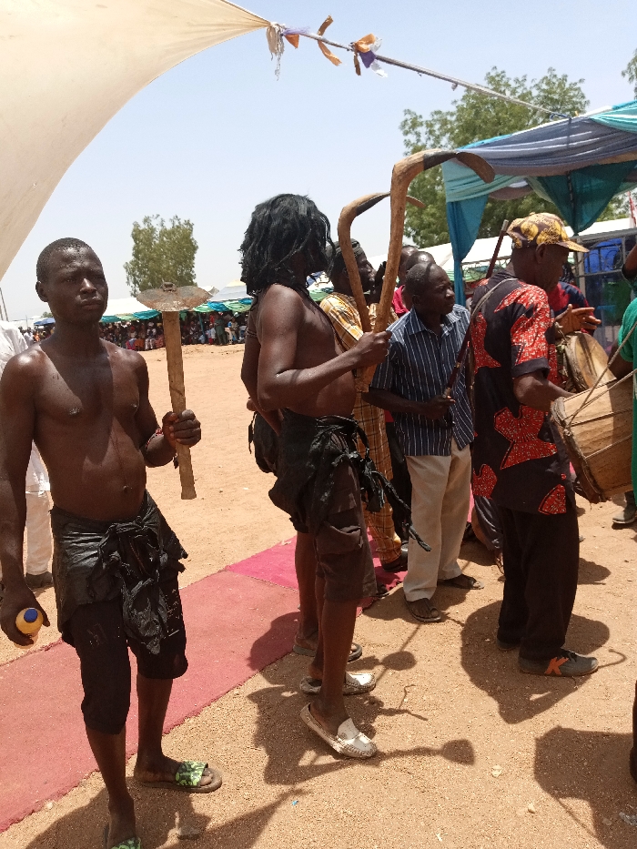 The image depicts a group of men in a public space in Zum, Nigeria, located at the coordinates 10.116 latitude and 13.046 longitude. The men are standing in a row, with the man at the forefront holding a wooden stick in his right hand. His left hand holds a blue container. The man is wearing a black loincloth and has no shirt on. The other men are all wearing clothing, some of which is traditional. One of the men wears a black loincloth and has his hair pulled back and tied. He appears to be holding a wooden stick. The ground is a light brown sand and there are red strips of cloth laid out on the ground. The environment appears to be a public gathering space with a few tents in the background.