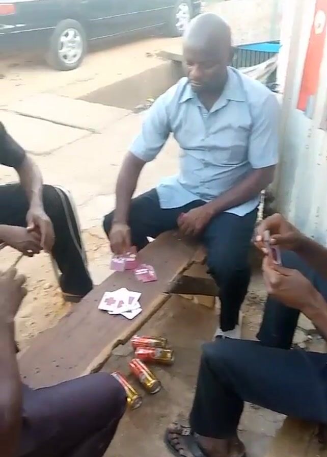 group of four men sitting outdoors playing cards. They are sitting on and around a wooden bench. Empty beverage cans are scattered on the ground next to them. In the background, there is a black car and signage for Coca-Cola products. The men are casually dressed. The camera circles the group.