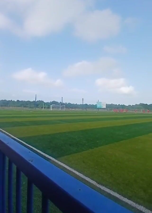 Here's a concise description of the scene: The video shows a view from behind a blue railing of a soccer field. The field has green and yellow artificial turf. A white line marks the edge of the field closest to the camera. In the distance, people in red jerseys are visible on the field. A soccer ball sits near the railing. The sky is blue with white clouds. Beyond the field, there are trees and possibly buildings.