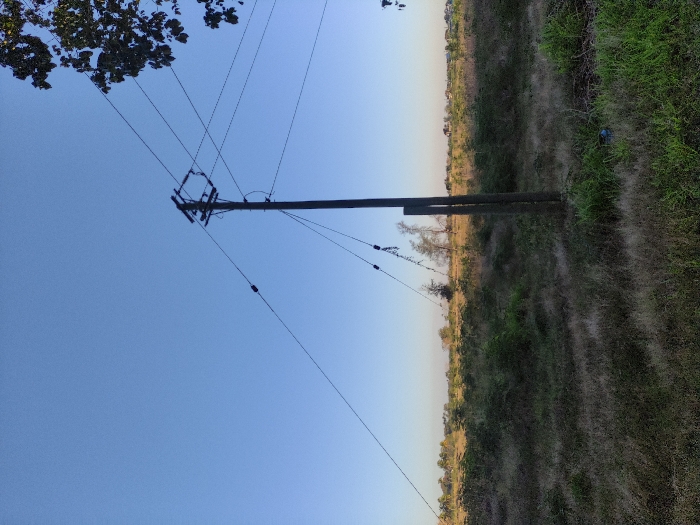 An outdoor shot shows a power pole standing in a field. Wires stretch from the pole against a clear blue sky. The field contains grass, vegetation, and a dirt path. A support beam is affixed to the pole. Foliage is visible in the top left corner.