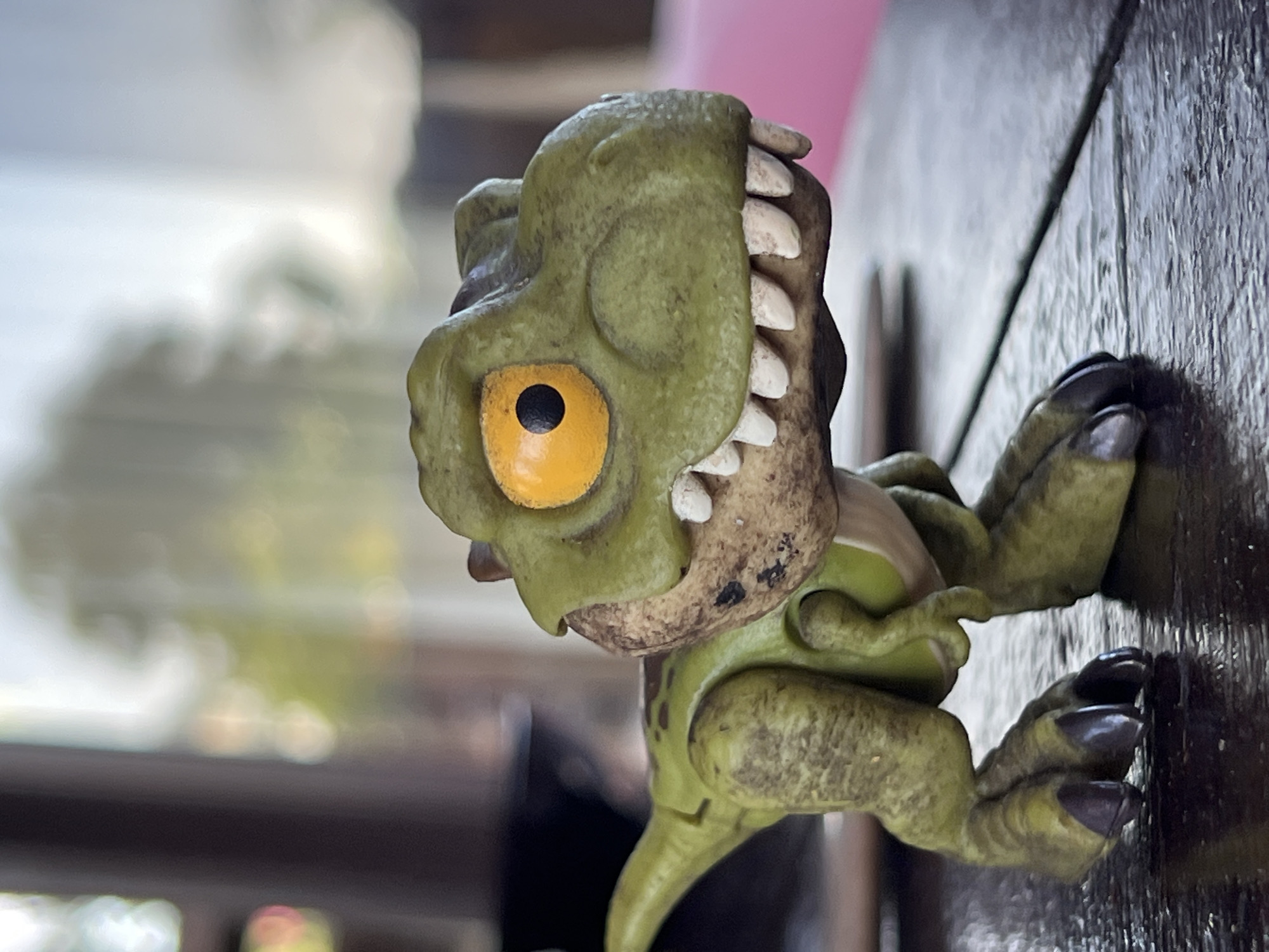 A close-up, medium-shot captures a green dinosaur toy seemingly climbing a vertical, dark wooden surface