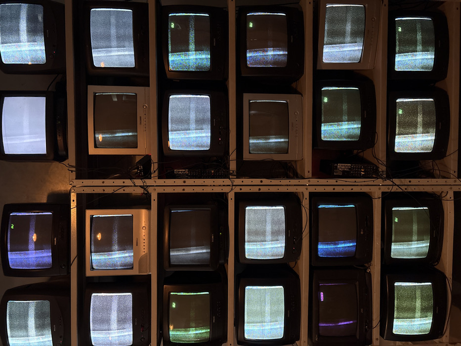 - "This image depicts a collection of twenty-four vintage CRT televisions arranged on two industrial-style metal shelving units in what is described as Saint Petersburg, Russia" by FM-9WZ5h1, licensed under CC BY 4.0