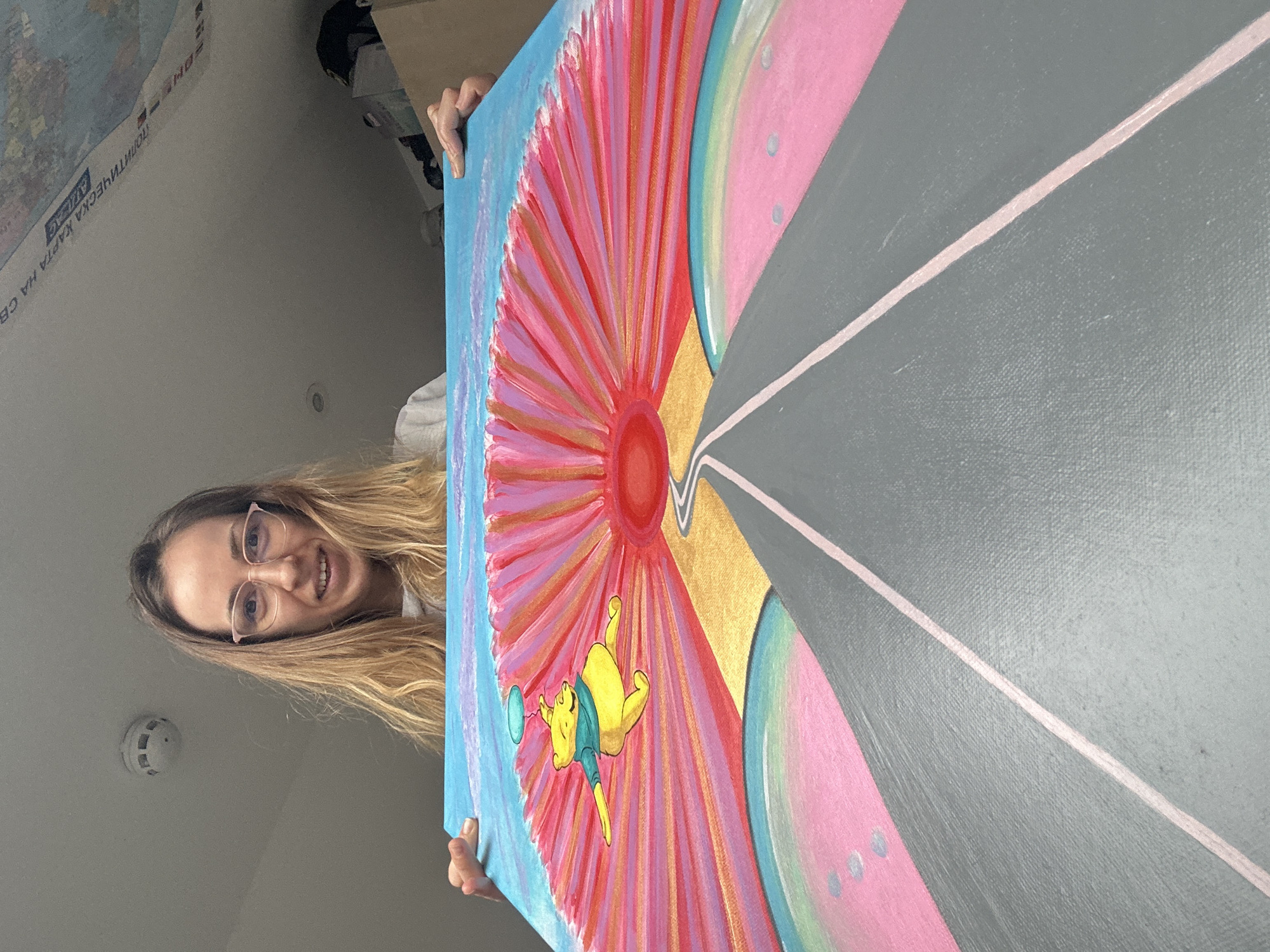 The scene depicts a female subject indoors, presenting a colorful, stylized painting
